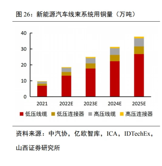 铜合金钢重要利适用衔接器接线接插件排,约占总承本的26.4%。衔接器生产加工业中下游重要为金属件材质、真空镀膜物品、塑料板材物品等。在当中金属件材质物品重要适用加工制作衔接接线接插件排,为避开卫星信号在视频传输时中会受到过重拘束或衰败,接线接插件排多适用磷青铜、红铜、裸紫铜等铜材的的最为原物品。在真空镀膜物品的选取上,以镀银、镀锡、镀镍和镀银等作作为主料。塑料板材物品 PA、LCP 等作作为主料,适用生产加工衔接器物品的设备壳。可利用电连技巧单位通知,真接原物品代价在各类汽车衔接器中占到比例60.29%,在微波射频衔接器中占到比例63.40%。可利用 Bishop&Associates 数据表格,铜材的的占衔接器总承本的26.4%。 不同中汽协与亿欧中国智库统计大数据库库,我过2021-2025年新清洁再生资源汽車平均销售量区分为352万辆、670 万辆、900 万辆、1130 万辆、1359 万辆。 不同 ICA 统计大数据库库,传统型汽車燃气轮机(ICE)用铜 23kg,结合電動汽車(HEV)用铜 40kg,充电结合電動汽車(PHEV)用铜 60kg,纯電動汽車(BEV)用铜 83kg,结合電動交通车车(Ebus HEV)用铜 89kg,纯電動交通车车(Ebus BEV)不同锂电发热量强弱用铜量建在224-369kg 范围内;你们主要包括 BEV 自行车用铜量 83kg 进 行算卦。 不同 IDTechEx 统计大数据库库,新清洁再生资源汽車用铜量中,锂电占有率48%,交流接触器占有率12%,压力整车电子电子整车整车束线占有率6%,血压非直流底压高整车电子电子整车整车束线占有率28%,相关占有率6%;经算卦,每台新清洁再生资源汽車血压非直流底压高整车电子电子整车整车束线用铜量为23.24kg,压力整车电子电子整车整车束线用铜量为4.98kg。 血压非直流底压高整车电子电子整车整车束线体系中,血压非直流底压高线览(通常情况下主要包括无氧金属丝)用铜量占有率约85%,血压非直流底压高接连器(通常情况下主要包括T2裸无氧紫铜镍钢带材)用铜量占有率约15%;压力整车电子电子整车整车束线体系中,压力线览(通常情况下主要包括降温纯铜)用铜量占有率约75%,压力接连器(通常情况下主要包括裸无氧紫铜、磷尊盘、铍尊盘等铜镍钢)用铜量占有率约15%;经算卦,自行车血压非直流底压高线览用铜量约19.75kg,自行车血压非直流底压高接连器用铜量约3.49kg,自行车压力线览用铜量约3.74kg,自行车压力接连器用铜量约0.75kg。 不同百川盈孚统计大数据库库,无氧金属丝软线、T2裸无氧紫铜带、T2裸无氧紫铜棒、磷铜带镍钢、铍铜镍钢的202一年成交均价区分为6.945亿/吨、7.625亿/吨、7.435亿吨、7.215亿/吨、16.685亿/吨。 经算卦,我过压力接连器用高端品牌铜镍钢2022-2025年意愿量为0.50/0.68/0.85/1.02千吨,2022-2025年我过新清洁再生资源汽車整车电子电子整车整车束线体系用铜市場规模性区分为137/184/230/2775亿。.jpg)
